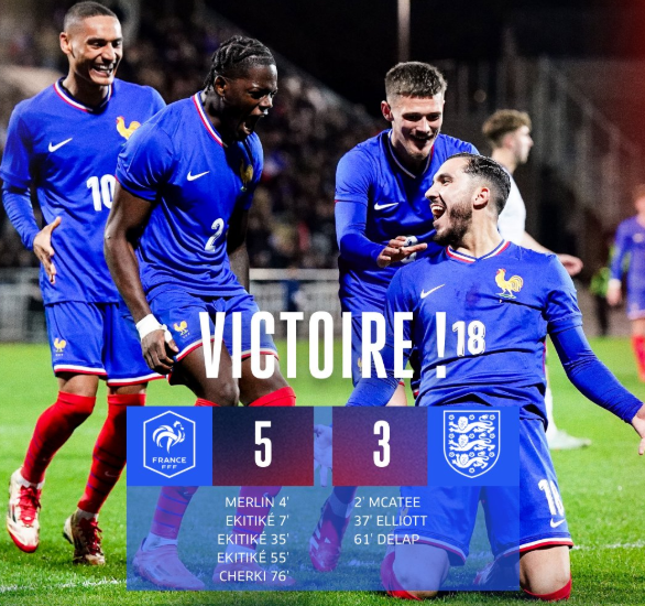 法国U21以5-3胜英格兰 谢尔基、埃基蒂克和奥多贝尔表现亮眼